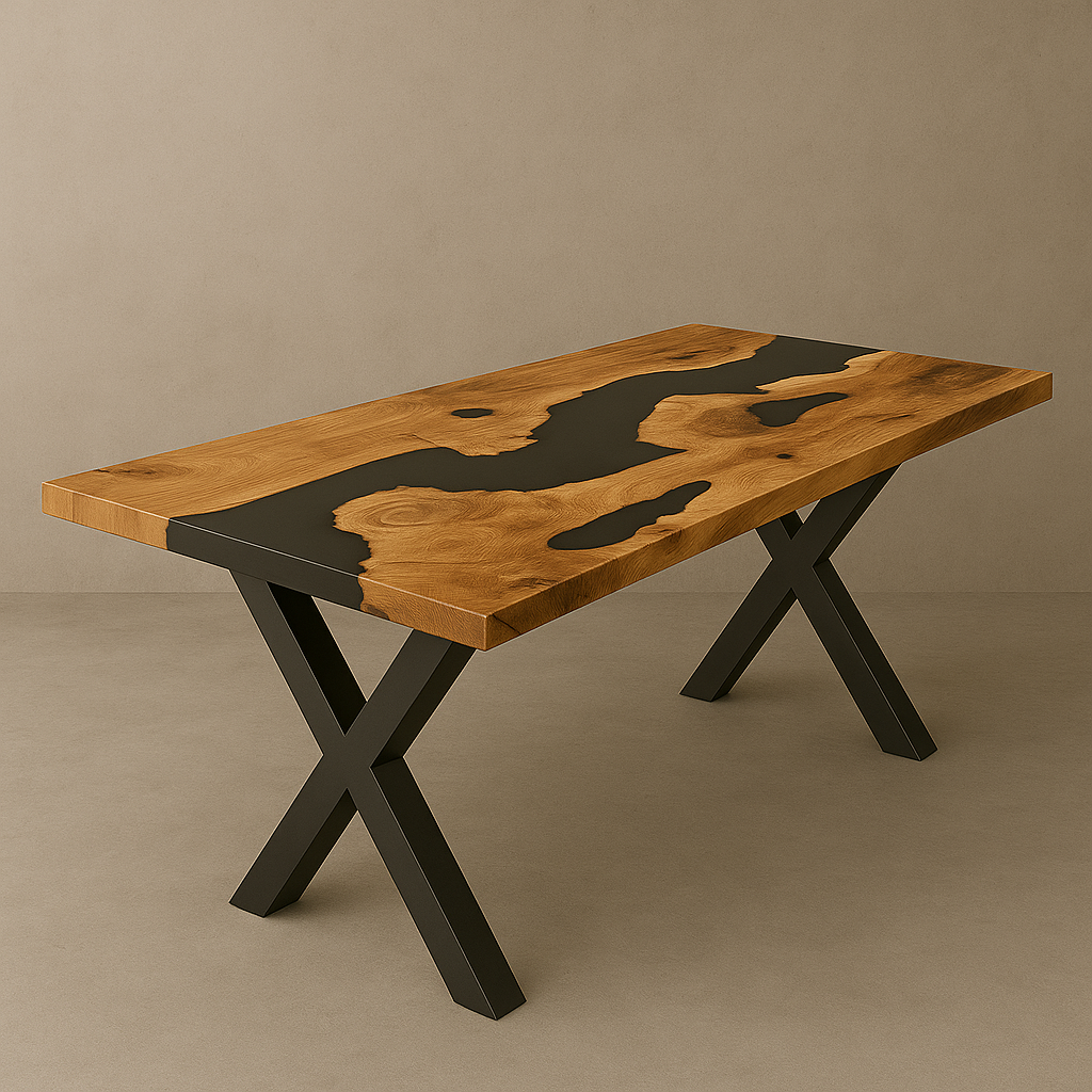 Dieser Esstisch wurde aus massivem Eichenholz gefertigt und mit schwarzem Epoxidharz zu einem einzigartigen Unikat veredelt. Die natürliche Form und Maserung des Holzes bleibt dabei erhalten und wird durch das Harz kunstvoll hervorgehoben. Das markante X-Gestell, aus schwarzem pulverbeschichteten Metall, rundet das moderne Design ab und verleiht dem Tisch Stabilität sowie Charakter.